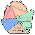 Union County was formed in 1850 from portions of Grainger, Claiborne, Campbell, Anderson, and Knox Counties. At least two theories are given on the source of its name. The name may commemorate the "union" of sections of five counties, or it may reflect East Tennessee's support for the preservation of the Union in the years before and during the Civil War.[4] The enabling legislation was initially passed January 3, 1850, but due to legal challenges and complications, the county was not formally created until January 23, 1856. The county seat was originally named "Liberty", but renamed "Maynardville" in honor of attorney and congressman Horace Maynard, who had defended the county in a court case that sought to block its formation.[1]