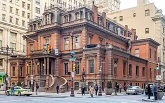 The club's Center City Philadelphia building, a Second Empire-style structure with a brick and brownstone façade was designed by John Fraser and completed in May 1865.[5] The opening was originally scheduled for March of that year, with President Lincoln in attendance, but was delayed due to wartime construction supply shortages. Christopher Stuart Patterson, formerly the Dean of the University of Pennsylvania Law School, was the 13th President of the Union League in 1897 and 1898.[6][7] In 1905, Philadelphia architect and Union League member Horace Trumbauer won a design competition to build major additions to the building. The Beaux Arts-style additions, completed in 1910 and 1911, expanded the length of the building to an entire city block.[8] The building was listed on the National Register of Historic Places in 1979.