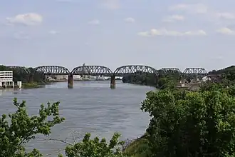 The new single-track railway bridge was completed in 1872 at a cost of $1.75 million ($45.9 million in present day terms). In 1877, a tornado weakened the two easternmost spans, requiring them to be replaced with a wooden trestle.[2]