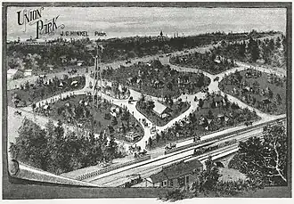 The original Union Park was a large recreational area located at the intersection of University and Lynnhurst Avenues in Saint Paul, Minnesota.[4] Also known as Lake Iris Park,[5] it opened in 1880 shortly after the completion of the Chicago, Milwaukee and St. Paul Railroad's "Short Line" route. The grounds of the park included a bowling alley, bandstand, dance hall, carousel, zoo and observation tower. By 1884 the amusement park had closed, and the property was divided into residential lots. The resulting neighborhood was also called Union Park.[6] All that remains of Lake Iris is the present-day Iris Park, a small public space with an artificial pond.[4]