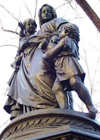 Union Square Drinking Fountain, also known as James Fountain, is an outdoor bronze sculpture and ornamental fountain by sculptor Adolf von Donndorf and architect J. Leonard Corning, located on the west side of Union Square Park in Manhattan, New York City. Cast in 1881 and dedicated on October 25, 1881, it was donated by Daniel Willis James and Theodore Roosevelt Sr. "to promote public health as well as the virtue of charity".[1] The statuary group includes a standing woman holding a baby in her right arm and a young child at her left side. They are set on an octagonal Swedish red granite pedestal with lion head fountains and basins on four of the sides.[1]