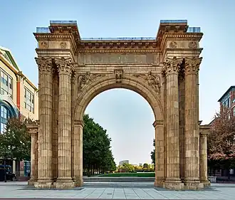 The Union Station arch is a 35 ft (11 m) Beaux-Arts arch standing at McFerson Commons Park in Columbus, Ohio. The work was designed by renowned architect Daniel Burnham, as part of a grand entranceway to the city's Union Station. It has intricate details, including Corinthian columns, multiple cornices and friezes, and statuary groups; some are currently in storage.