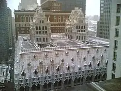 Designed by Frederick J. Osterling, the building was constructed on the site of Pittsburgh's nineteenth century St. Paul's Catholic Cathedral.[4][5] It is not known to have been modeled after any particular building, but Brussels Town Hall, Leuven Town Hall (both Brabantine Gothic) and the then-new Woolworth Building have been suggested as influences.[6] The design has also been partially attributed to Pierre A. Liesch (1872–1954), who worked with Osterling on the project. Liesch was a native of Luxembourg and later used a similar Flemish Gothic style for his design of the Croatian Fraternal Union Building.[7]