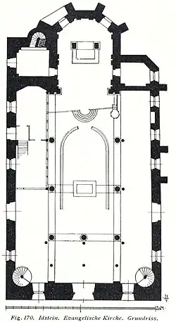 Idstein became Lutheran during the Reformation. After the Thirty Years' War, the church was transformed to a representative Baroque Predigt- und Hofkirche (sermon and court church) by Count Johann of Nassau-Idstein. The restructuring lasted from 1665 to 1677. While the nave was retained, the church was expanded to the west, and the walls were raised, resulting in flatter roofs. Most of the pillars were removed, oval windows were installed in the clerestory, and portals were rounded.[1] Arnold Harnisch (Mainz) and Hans Martin Sattler (Idstein) removed the vaults and built Marmorarkaden (marble arcades). Galleries were installed on three sides in 1675.[1]