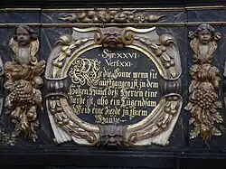 There were reserved chairs for certain senior members of society in royal government, municipal government, administration, jurisprudence, presiding roles, and the citizenry (Herrschafts-, Rats-, Sekretär-, Gerichts-, Vorsteher-, Bürgerstuhl). Plaques on the respective balustrades show biblical quotations relevant to the position.[1]