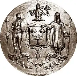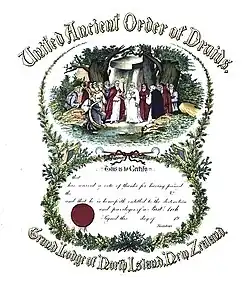 The creation in 1833 of the United Ancient Order of Druids was the result of a split in the Ancient Order of Druids; a significant part of the members decided to create a druidic order more open to different social classes, structured as a benefit society and registered by government.[1] During the first decades, the UAOD kept the same emblem as the AOD (a shield with three oaks surrounded by a Celtic warrior and a druid), changing the motto to united to assist. Very soon, the UAOD proved to be a great success and many of its members travelling abroad created new lodges in United States of America (1839), Australia (1851), New Zealand, and the German empire (1872). In 1858, the UAOD separated itself in two parts, and a new fraternal society, the Order of Druids was created.[2] After World War II the organisation faded, as the generalisation of the welfare state provided people with all that was its purpose. Its last Lodge in England, "Caracus", closed in 1999 but the UAOD still remains in several countries as the United States, Australia, Germany, and Northern European countries.