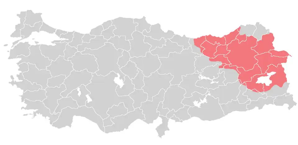 Western Armenia refers to an undefined area, now in eastern Turkey, that had significant Armenian population prior to the Armenian genocide of 1915.[158][159] As a result of the genocide, officially no Armenians live in the area today.[160] However, at least two distinct groups of Armenian origin reside in the area. Hemshin peoples, an Islamisized group with Armenian ethnic origin,[161][162] live in the Black Sea coast, particularity in the Rize province.[163] Another group, "Hidden Armenians", live throughout Turkey, especially the eastern parts of the country. Many of them have been assimilated by Kurds. It is impossible to determine how many there are due to the fact that they keep their identity hidden, but estimates range from below 100,000 to millions.[164] Since the Armenian Genocide, the area has been mostly settled by Kurds and Turks,[165] with smaller numbers of Azerbaijanis (near the Turkish-Armenian border)[166] and Georgians and Laz people in the northeastern provinces of Turkey.[167][168]
