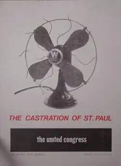 The Congress' most notable public show was The Castration of St. Paul, at the Nickle Arts Museum on the University of Calgary campus in February/March 1991.[10]: 46-49 [11] Castration was intended to critique what The United Congress called the patriarchal nature of Christianity, and the show created "a virulent reaction" in the local press.[10]: 49 Castration featured thirty low-resolution colour xerox enlargements of Polaroid photographs of naked male torsos. Each enlargement was carefully framed and labeled with the name of a historic Christian religious figure, including the twelve Apostles, seven Old Testament Prophets, five early Christian Saints, the Trinity, John the Baptist, Martin Luther, and Pope John Paul II.[10]: 46 Also part of the exhibit was a public lounge area featuring select pamphlets and literature promoting Christian organizations who espoused 'traditional values' which the collective considered to be encouraging the subordination of females in family and public life.[10]: 46