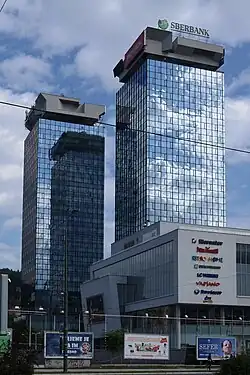 The UNITIC Twin Skyscrapers, designed by Ivan Štraus, were built in 1986 in the Marijin dvor neighborhood of Sarajevo. They were colloquially named "Momo and Uzeir" after a Yugoslav radio comedy show duo made up of Bosniak Rejhan Demirdžić and Serbian-born Rudolf "Rudi" Alvađ. The towers were heavily damaged by shelling during the siege of Sarajevo in the Bosnian War, but remained standing, becoming symbols of resilience.[1] They were renovated after the war.
