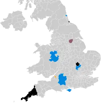 All 27 county councils, 7 out of 55 unitary authorities, 1 sui generis authority, and 3 directly elected mayors | |||||||||||||||||||||||||||||||||||||||||||||