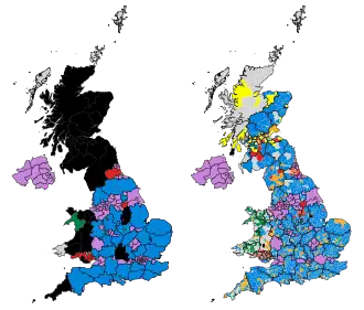 ![]() Map showing council control (left) and largest party by ward or division (right) following the election. | |||||||||||||||||||||||||||||||||||||||||||||||||||||||||||||||||