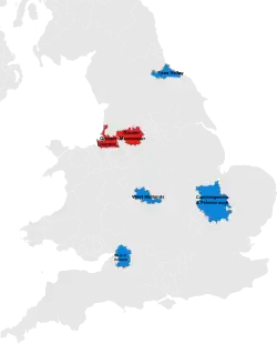 Other planned mayoralties have been postponed or cancelled.[47] The election of the Sheffield City Region Combined Authority mayor was postponed in January 2017[48] and, following legal action, did not occur until the 2018 local elections.[49] The North East Combined Authority deal was scrapped as several councils in the region voted down the proposal,[50] however the smaller North of Tyne combined authority was approved by the councils and by parliament for the 2019 local elections.[51] The other devolution deals that were scrapped were for the Norfolk and Suffolk,[52] Greater Lincolnshire[53] and the Solent.[54]