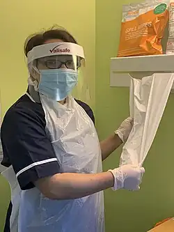 As early as February 2020 frontline healthcare workers began to raise their concern regarding the UK's preparedness to cope with a large-scale outbreak.[12] On 16 March, primary care magazine Pulse reported doctors were receiving out-of-date PPE that had had its 2016 use-by date covered with a sticker saying "2021".[13] In response, the government offered reassurance that this was safe.[14] Earlier in the month, in response to a survey of Pulse's readership, two out of five GPs reported they still did not have PPE to protect them from coronavirus.[13] Some of these concerns were raised with Johnson during Prime Minister's Questions, to which the Prime Minister replied the UK had "stockpiles" of PPE.[15] The same day, the Doctors' Association UK (DAUK) reported NHS staff felt they were being put at risk due to lack of PPE.[16]