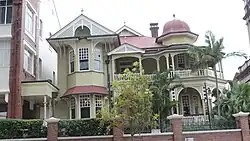 The Green House is an ornate two-storey timber and brick building with an asymmetrical facade and a multi-gabled roof in painted corrugated iron, facing south across Wickham Terrace. The Green House has a projecting gable and faceted bay with an octagonal domed roof on the southern elevation and a second projecting bay along the eastern elevation. Both bays have decorative timber bargeboards. To the rear of the building is a carpark area and later extensions by the United Service Club which connect the Green House to Montpelier.[1]