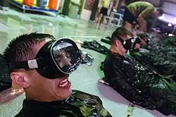 Indoctrination Course (currently A&S) Training Gear is essentially made up of a high volume face mask, a silicone snorkel, rocket fins and booties. The mask and snorkel are key throughout training, being used in water confidence training such as water inserted into the mask throughout the training, simulating the effect of being underwater regardless of whether submerged or not. Mask and snorkel recovery is a key portion that is tested on, in which the trainee has to recover the mask and snorkel from the deep end of the pool, "clearing" the mask of water while still submerged and "clearing" the snorkel of water as well. These two can be referred to as key training tools. Items such as rope and booties can be used to further increase the intensity of water confidence training.[22]