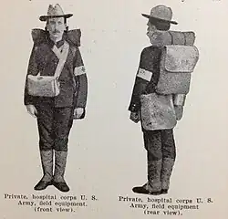 The Hospital Corps was created in 1886 was to be composed of Hospital Stewards, Acting Hospital Stewards and Privates, the number of which were to be decided by the Secretary of War. Enlisted men not belonging to the Corps would not be detailed to medical service. The members of the Corps would perform all enlisted medical services in hospital and in the field.[12] In 1896 the Congress fixed the number of hospital stewards to 100. The Corps then had about 100 acting hospital stewards and about 500 privates.[13] In 1901, the rank of Lance Acting Hospital Steward was given to prospective hospital stewards during a probationary period, and in 1903 the rank of Corporal was introduced; specifically created for those men who were good leaders but unable to pass the required examinations for promotion.[14] In 1903, the ranks of the hospital stewards were put in line with the rest of the army; Hospital Stewards becoming Sergeants First Class, Acting Hospital Stewards becoming Sergeants, Lance Acting Hospital Steward becoming Lance Corporals.[15] By 1909, the rank of Private First Class had been introduced, in the proportion not exceeding one to two privates. The Corps then had 300 sergeants first class, 300 sergeants and 20 corporals.[16] The largest strength of the Corps occurred during the Spanish–American War; in June 1898 it contained 133 hospital stewards, 172 acting hospital stewards and 2,940 privates. The peak was reached in November the same year with about 6,000 men serving in the Corps, although about 22,500 were needed.[17][18]