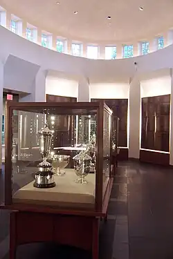 The oval rotunda, illuminated by a clerestory, houses all 13 USGA national championship trophies, while the names of every USGA champion, such as eight-time winners Bobby Jones and Tiger Woods, are inscribed on bronze panels that encircle the room.