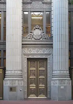 The building is five stories tall including a mezzanine level and, after its 1925 expansion, occupies a 100-by-200-foot (30 m × 61 m) area, along the north side of SW Stark Street from Sixth Avenue to Broadway.[32] The eastern façade, facing Sixth Avenue, features six freestanding Corinthian columns, each 54 ft (16 m) in height. These support a portico that is topped by a large and richly decorated Roman frieze, a cornice and balustrade. Decorations on the cornice include lion heads and palmettes.[14] At the back of the portico, and behind the columns, are two Corinthian pilasters, at the far left and right ends of the façade. Between these are "five vertical bays separated by piers made of coursed, rusticated terra cotta. Window openings are set in cast-bronze frames."[14] The five windows at the second-floor level are topped by cast-bronze segmental pediments. There are three entrance doorways in the three central bays, although originally there was only one. The central entrance features a pair of large bronze doors with highly decorated bas relief panels, surrounded by detailed terracotta, including replicas of early Greek, Roman and U.S. coins[33] in the decoration framing the door, and a heraldic eagle in a pedimented cornice above the doorway. The bronze relief panels were cast in 1931, replacing the 1917 door panels.[19] Designed by Avard Fairbanks, they "depict noble concepts of American life, such as 'Knowledge and Service', 'Domestic Welfare', 'Progress through Direction', and so on."[19] Fairbanks also designed bronze relief panels for the building's western façade, built in 1925.
