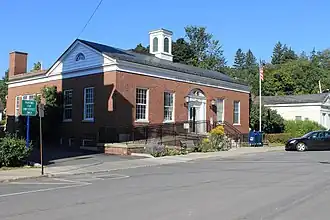 US Post Office-Delhi is a historic post office building located at Delhi in Delaware County, New York, United States. It was built in 1938, and is one of a number of post offices in New York State designed by the Office of the Supervising Architect of the Treasury Department, Louis A. Simon. It is a symmetrically massed one story brick building with a stone watertable in the Colonial Revival style. The front section features a copper clad gable roof crowned by a square flat-topped cupola with Doric order pilasters and round arched vent openings on each face. The interior features a 1940 mural by artist Mary Earley titled Down-Rent War, Around 1845.[2]