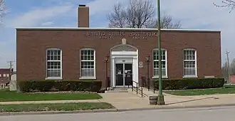 The United States Post Office, located at 825 1st Avenue E., is the main post office serving Horton, Kansas. The Neoclassical building was built circa 1937-38 and designed by Supervising Architect Louis Simon. The inside of the post office includes two murals, both painted by Kenneth Evett for the Treasury Department's post office mural program; the additional mural is unusual for a small post office. The first mural, titled Picnic in Kansas, was completed in 1938 and depicts a large family at a picnic. The second mural, titled Changing of Horses for the Pony Express, was completed the following year and shows a Pony Express rider leaving a station.[2]