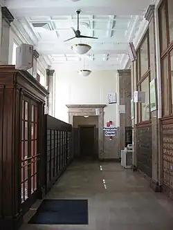 The interior of the post office is built primarily of marble and of hardwoods.[2]: 5 Its ceiling is constructed primarily of heavily contrasting marble coffering.[3]