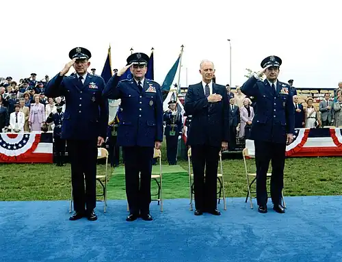 Secretary of the Air Force Verne Orr with Chairman of The Joint Chiefs of Staff General David C. Jones and Air Force Chief of Staff General Lew Allen and Air Force Vice Chief of Staff General Robert C. Mathis at Bolling Air Force Base on May 28, 1982