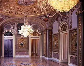 The United States Senate Reception Room is located in the United States Capitol and is one of the Capitol's most richly decorated public rooms that features the work of Italian artist Constantino Brumidi.[1] The room, numbered S-213, has historically been used for meetings and ceremonies. These decorations feature nine permanent portraits of the greatest senators as determined by a Senate committee. These portraits are placed in massive and ornate golden frames.[2]