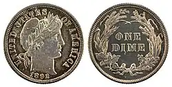 The Barber dime, as with all previous dimes, featured an image of Liberty on the obverse. She is wearing a Phrygian cap, a laurel wreath with a ribbon, and a headband with the inscription "LIBERTY". This inscription is one of the key elements used in determining the condition of Barber dimes.[3] Liberty's portrait was inspired by two sources—French coins and medals of the period, as well as ancient Greek and Roman sculpture. The obverse also contains the long-used 13 stars (for the 13 colonies) design element. The reverse contained a wreath and inscription almost identical to the one used on the final design of the Seated Liberty dime.[14] Dimes were produced at all four of the mints that operated during the period. While circulated coins of the entire series are readily available to collectors there is one outstanding rarity, the 1894-S Barber Dime. Twenty-four were minted, with 9 currently known.[15]