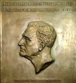 Another controversy surrounding Sinnock's design involves his image of Roosevelt. Soon after the coin's release, it was claimed that Sinnock borrowed his design of Roosevelt from a bas relief created by African American sculptor Selma Burke, unveiled at the Recorder of Deeds Building in Washington, D.C. in September 1945. Sinnock denied this and stated that he simply utilized his earlier design on the Roosevelt medal.[17]