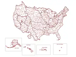 Originally a four-tier system divided into regions, sub-regions, accounting units, and cataloging units, each unit was assigned a unique Hydrologic Unit Code (HUC). As first implemented the system had 21 regions, 221 subregions, 378 accounting units, and 2,264 cataloging units.[1][2] Over time the system was changed and expanded.[3] As of 2010 there are six levels in the hierarchy, represented by hydrologic unit codes from 2 to 12 digits long, called regions, subregions, basins, subbasins, watersheds, and subwatersheds. The table below describes the system's hydrologic unit levels and their characteristics, along with example names and codes.[4]