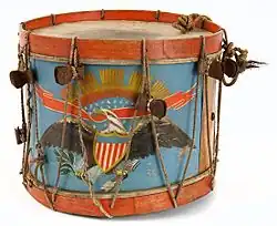 During the American Revolution, some military units, lacking heraldic insignia, painted eagles on the facing of their drums (in the British custom a regiment's armorial achievement would be used to decorate drums). This tradition continued after the war, and the decoration of drums with eagles in various poses, often dictated by the tastes of the individual band, continued.[23] By the War of 1812, eagles were required to be painted on a blue ground for infantry units and red for artillery, though the design of eagles remained a largely individual art.[23][24] Beginning in the 1840s, the U.S. Army attempted to standardize the eagles used on drums and, by the Civil War, stencils were issued to bands to apply the authorized designs, though some flair continued in the finishing and painting of the final product.[24][25] With the later establishment of the Army Institute of Heraldry, eagle drums were phased out in favor of drum designs emblazoned with distinctive unit insignia, a return to the British tradition.[23] Today, The U.S. Army Field Band and the U.S. Army Band "Pershing's Own" use "eagle drums".[23] Those drums feature an eagle design created by Gus Moeller known as "the Grand Republic".[26]