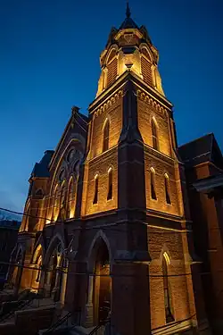 Originally constructed for the Methodist church to host their annual regional meeting, the Hall has hosted politicians and activists including William Jennings Bryan, Henry Ward Beecher, Frederick Douglass, Senator Edgar T. Brackett and President William Howard Taft. In 1976 the Methodists sold the building to the Universal Baptist Church, who used it until the building’s deteriorating state made it unsafe; in 2000, the building was condemned.[2] In 1999, citizens of Saratoga Springs joined with members of the Baptist Church to rescue the Hall from collapse. They formed a partnership to rebuild it as a performance and events center, while creating a separate worship space for the Baptists within the building. The new sanctuary for the Baptist Church was completed in 2004 and services are held there every Sunday.