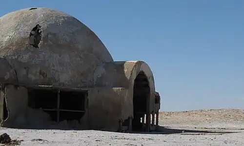Tatooine is a desert planet located in the Outer Rim Territories of the galaxy, orbiting a binary star system.[19] It is depicted as a remote, arid world with harsh climatic conditions, limited water resources, and minimal political influence on galactic affairs.[G 15] The planet serves as the birthplace of Anakin Skywalker and the childhood home of Luke Skywalker, thereby occupying a significant position within the overarching narrative of the saga. Tatooine's surface is characterized by expansive dune seas, rocky canyons, and isolated moisture farming communities that utilize atmospheric condensers to extract water. Major settlements include Mos Eisley, a spaceport known for its criminal underworld activity, and Mos Espa, a trade hub noted for hosting podracing events. Indigenous species include the nomadic Tusken Raiders and the scavenging Jawas, both of whom have adapted to the planet's extreme environment.[G 16] The landscape George Lucas chose to depict in Tatooine scenes was largely based on real-world geographical features. Southern Tunisia’s semi-arid and desert climate provided a suitable environment for filming, representing the planet’s harsh conditions. Several key scenes involving Luke Skywalker and Darth Vader’s early lives were shot in this region, and the film sets have since become notable cultural landmarks in Tunisia.[20] Tunisia is also the namesake of the planet Tatooine. Although George Lucas initially intended to name the planet Utapau, he changed it during the filming of Episode IV upon realizing the name was similar to that of a female character in Star Trek. The planet was subsequently named after the Tunisian city of Tataouine, which served as a base for Lucas and his crew during production.[20] George Lucas used three Tunisian ksour—fortified Berber granaries—in and around the city of Tataouine to represent the slave quarters featured in the Star Wars prequel films. These included Ksar Hadada, Ksar Ouled Soltane, and the ksar of Medenine.[21]