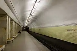 Universitet (Russian: Университе́т, English: University), named after the nearby Moscow State University, is a station on the Moscow Metro's Sokolnicheskaya Line.[1] It opened in 1959 and has rectangular white marble pylons and tiled walls. The architects were V. Litvinov, M. Markovsky, L. Lile and V. Dobrakovsky. The station's two round entrance vestibules (architect Ivan Taranov) are located on either side of Prospekt Vernadskogo at Lomonosovsky Prospekt.