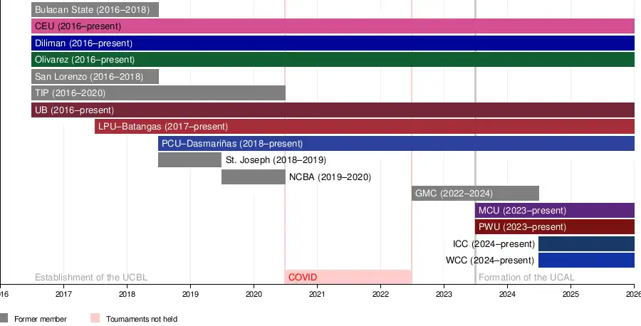 As Season 6 approached, Manila Central University (MCU) and Philippine Women's University (PWU) joined as new league members, but the league itself would later undergo an evolution. The UCAL organization added volleyball and esports to go alongside the existing basketball competition, marking the first multi-sport season and the formation of the UCAL, with the UCBL becoming the UCAL's basketball championship.[1] For Season 7, it will add two more institutions in Immaculada Concepcion College (ICC) and WCC Aeronautical & Technological College (WCC) alongside a new streetdance competition. On the other hand, Guang Ming College will take a leave of absence.[7]