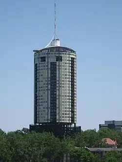 The University Club Tower is a residential skyscraper in the Riverview Historic District of Tulsa, Oklahoma. The building rises 377 feet (115 m).[2] It contains 32 floors and was completed in 1966.[1] The University Club Tower currently stands as the 8th-tallest building in the city, and the 15th-tallest building in the state of Oklahoma. It also currently stands as the tallest all-residential building in Tulsa and Oklahoma.[1] The circular building, marked by unusual floor plans surrounding its central core, was the first major building in the United States to be designed using a computer.[3]