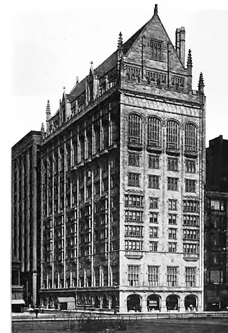 The club's present building, begun in 1907 and completed in 1909, is a historic landmark designed by notable architect Martin Roche, and is arguably the first "gothic skyscraper" in Chicago. At a cost of over $1.1 million (over 38.5 million in 2024),[1] it was one of the most important club buildings of its day and continues to be an architecturally significant structure.