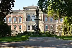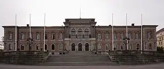 Before the completion of the present building, the main lecture hall of the university had been housed in the nearby Gustavianum, while the administration was housed in the Consistory House (Konsistoriehuset) and the academic ceremonies took place in the Carolina Rediviva university library building. The chosen site for the new building was previously occupied by a riding exercise court belonging to the university.[1] Planning and construction took place during a 10-year period, with the winning proposal designed by Herman Teodor Holmgren, a student of Fredrik Wilhelm Scholander. Holmgren had studied Beaux-Arts architecture in France, Italy and Germany and the university building became the largest of his works and the most well-known, counting among the foremost examples of this architectural style in Sweden and Scandinavia.[2] The building contract was awarded to the C H Hallström building company.