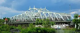 By the first decade of the 20th century, the city sold the Harlem Ship Canal Bridge to the Interborough Rapid Transit Company (IRT), which was constructing the New York City Subway's first line.[38] A branch of the line was to cross the Harlem Ship Canal above Broadway,[39] which involved modifying or replacing the existing bridge.[40] Ultimately, the IRT determined the existing structure could not support the elevated subway line,[23][41][42] choosing instead to build the double-decker Broadway Bridge.[4][28] The need to replace the bridge was further emphasized when, in 1903, the New York State Legislature passed legislation allowing the realignment of the New York Central Railroad's Spuyten Duyvil Line (now the Metro-North Railroad's Hudson Line) along the Harlem River's eastern bank.[43][44] The railroad wished to avoid a grade crossing with the Metropolitan Street Railway's streetcar tracks on the replacement Broadway Bridge.[26][38]