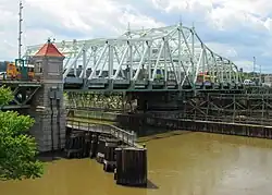 To the north, the New York City Department of Public Works was commissioned in 1892 to build the Harlem Ship Canal Bridge between Inwood and Marble Hill, carrying Broadway over the new canal.[8][36] This bridge was designed by Burr, Boller, and Birdsall, and constructed by A. McMullen & Co.[8] The bridge opened on January 1, 1895.[8][26][37] At the time, it was one of several swing bridges that had been built on the Harlem River, and it was the second oldest major bridge in New York City behind the Brooklyn Bridge.[8]