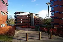 The Faculty of Commerce and Social Science, now known as the Ashley Building, was designed by Howell, Killick, Partridge and Amis and is a long, curving two-storey block linked to a five-storey whorl. The two-storey block follows the curve of the road, and has load-bearing brick cross walls. It is faced in specially-made concrete blocks. The spiral is faced with faceted pre-cast concrete cladding panels.[25] It was statutorily listed in 1993[64] and a refurbishment by Berman Guedes Stretton was completed in 2006.[65]