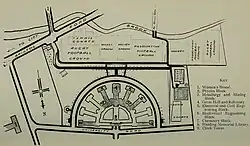 The original domed buildings, built in Accrington red brick, semicircle to form Chancellor's Court. This sits on a 30 feet (9.1 m) drop, so the architects placed their buildings on two tiers with a 16 feet (4.9 m) drop between them. The clock tower stands in the centre of the Court.