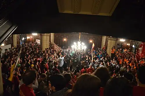 "The Hunt" begins ceremoniously at midnight of the Wednesday preceding Mother's Day weekend, with an event known as "List Release."[5] The ceremony surrounding the unveiling of the list usually begins a few hours before midnight, as teams slowly assemble on the ground floor of Ida Noyes Hall. These teams (ranging in size from 1 to over 250) then participate in what has been described as collective effervescence, as they chant various team-based and humorous slogans, eventually coalescing into a repeated "we want the list".[6][7] Then, at midnight, the judges (members of the University of Chicago Scavenger Hunt Organizing Committee) run into the center of this gathering, and announce that year's list release challenge.