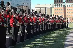The marching band uses the roll step and glide step when performing. The marching snare section uses Traditional Grip while playing. The Bearcat Marching Band is known for its contemporary approach to both music and drill design. Over 250 UC students come together to form the band's membership. This includes the all instrumentalists, the Bearcat Guard, Twirlers, and Drum Majors corps.[3]