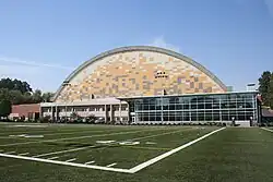Idaho Central Credit Union Arena (ICCU Arena), located immediately to the north of the Kibbie Dome, became the new home of Vandals men's and women's basketball for the 2021–22 season. The university had attempted to build a new arena to replace Memorial Gym for over 50 years,[35] but nothing came of the plans until 2018, when a $10 million naming gift from Idaho Central Credit Union encouraged the administration to go forward with construction.[36] Ground was broken the following year.[37] The 4,200-seat facility, costing about $51 million, is primarily made from engineered wood, with the superstructure consisting mainly of over 850 Douglas fir beams prepared from trees logged at the university's experimental forest. Several major forest products companies assisted in the construction process.[35] The arena opened for a media tour on September 29, 2021, with the basketball teams using the main arena and an included practice court during preseason practice.[35] The first event in the new arena was a men's basketball exhibition against NAIA member Evergreen State on October 29.[38] The first regular-season game was a men's game against Long Beach State on November 10.[39] This game served as a homecoming for Beach head coach Dan Monson, son of former longtime Vandals head coach Don Monson and himself a former Vandals football player.[40]