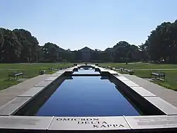 Running parallel to McKeldin Mall to the north is Campus Drive, the main thoroughfare through campus. Another thoroughfare, Regents Drive, runs perpendicular to the Mall and is home to the Memorial Chapel and the Campus Farms. Regents Drive crosses Campus Drive at the campus hallmark, The "M", which is a mound with a large "M" formed by flowers in its center.[51] The northeast quadrant of campus, formed by Campus and Regent Drives, is home to many of natural sciences and applied sciences departments. The Rossborough Inn, which, was built during the years 1798 to 1812, is the oldest building on campus (and is older than the university itself).[52] There are five regularly used entrances to campus; the main entrance, off of Baltimore Avenue and onto Campus Drive, is referred to as North Gate and features the Gatehouse, an ornate gateway honoring the university's founders.[53] The 140-acre (57 ha), 18-hole University of Maryland Golf Course sits at the northern edge of campus, as does the Observatory.[54]