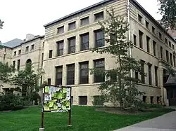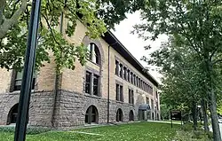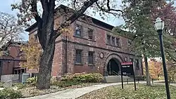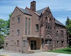 Originally known as Science Hall, it was renamed in honor of Governor John S. Pillsbury during construction.[8] Harvey Ellis, Buffington's assistant, was responsible for the Richardsonian Romanesque details of the design. Though Ellis was inspired by the aesthetic of Henry Hobson Richardson, the building also contains elements of the Prairie School, Arts and Crafts, Gothic, and Victorian styles. The building is built with two different colors of sandstone. The buff-colored sandstone is from quarries near Banning State Park, while the red sandstone is from the Fond du Lac formation. The clay tile roof and copper eaves serve to protect the sandstone from the infiltration of water, and they also add to the appearance of the building.[9] Reflecting its earthen architectural elements, the building housed the Newton Horace Winchell School of Earth Sciences until 2017. The building underwent a renovation and reopened in 2022, now home to the University's English department.[10]