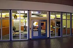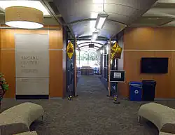 Originally located on the fourth floor of the Cathedral of Learning, the 2,500-square-foot (230 m2) $537,000 McCarl Center was opened in 2002[7] and occupies space that once housed two levels of the main stacks of the university's library.[8] Made possible by a gift from F. James and Foster J.J. McCarl, it serves as resource center for non-traditional students and hosts seminars and events.[9] The space was designed by Alan J. Cueri and his architectural firm Strada, LLC, and includes wood finishes, double-height spaces with high ceilings and windows, a main corridor conceived as an interior street, and many elements that refer to the Cathedral of Learning's Gothic architecture including decorative painted metal columns with contemporary buttress-style arches.[10] The center included a resource library, meeting rooms, and a student lounge, and is staffed with academic advisors and has contains a reception area for the College of General Studies.[11] Three unsigned and undated 7 feet (2.1 m) by 3 feet (0.91 m) glass-encased murals that depict Renaissance painting styles and which have long belonged to the university but are of unknown origin hang in a hallway outside the center.[12]