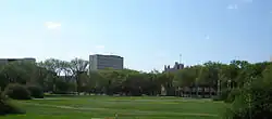 The original architectural plan called for the university buildings to be constructed around a green space known as The Bowl. The original university buildings are now connected by skywalks and tunnels. Clockwise, from the north; Thorvaldson Building (August 22, 1924) (Spinks addition); Geology, W.P. Thompson Biology (1960) adjoined to Physics Building (1921); College Building (May 1, 1913) (Administration addition); Saskatchewan conjoined with Athabasca Hall (1964); Qu'Appelle Hall (1916); Marquis Hall adjoined to Place Riel – Qu'Appelle Addition; Murray Memorial Main Library (1956); Arts (1960) conjoined with Law and adjoined to Commerce building complete the initial circle around the perimeter of the bowl.[34][35]