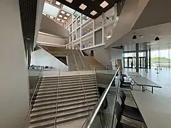 Double cohort brought challenges to the teaching, study and residence spaces at the campus due to increase in first-year enrollment. In response, the Academic Research Centre (ARC) and Joan Foley Hall were constructed.[17] The ARC was built in 2003 as an extension of the Bladen Building with a copper finish. It allowed for the relocation and expansion of the library to its present state and introduced the campus's first 300-seat lecture theatre, which has since held the Watts Lecture series, after formerly being held in the Meeting Place. The Doris McCarthy Gallery, also found in the ARC, exhibits works by local artist and campus alumni, Doris McCarthy. The Student Centre was opened in 2004 through a project that was initiated and funded by students. Constructed using 18 tonnes of recycled steel from a demolished gallery at the Royal Ontario Museum, the three-storey Student Centre earned a Leadership in Energy and Environmental Design (LEED) certification as well as a Green Design Award from the City of Toronto.[18] The Social Sciences Building, home of the Department of Social Sciences, also opened in 2004 as the Management Wing but took its present name after the completion of the Instructional Centre in 2011, which became the new home of the Department of Management, the Department of Computer and Mathematical Sciences, and offices of cooperative education programs. Brick and limestone were used to create the Arts and Administration Building, completed in 2005,[19] which holds the principal's office.[20] The Science Research Building, where post-graduate research facilities and a lecture hall are located, is an extension of the Science Wing that was completed in 2008.[21]